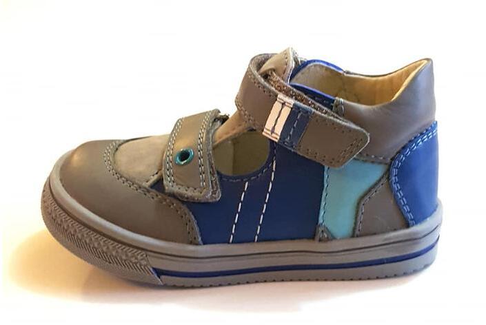 LINEA félig nyitott szandálcipő kisfiúknak szürke színben, oldalán türkizkék csillag mintával,     Cipő jellemzői: